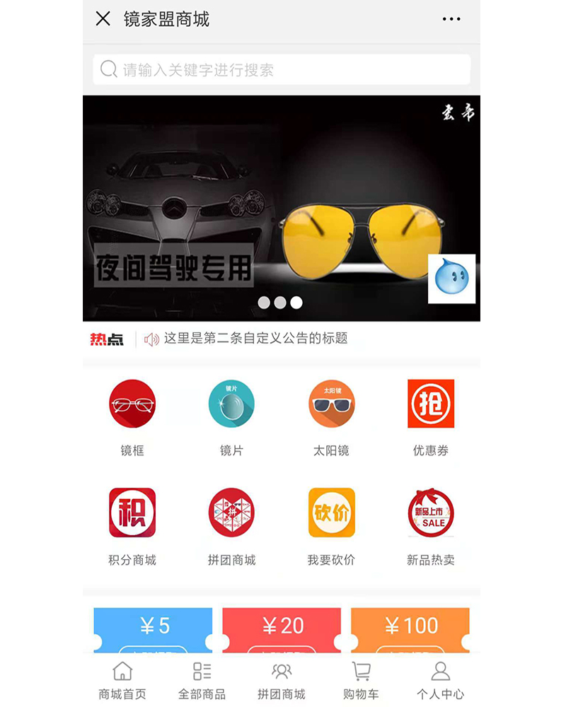 該應(yīng)用是專為眼鏡愛好者的購(gòu)物公眾號(hào),設(shè)計(jì)開發(fā)積分商城、拼團(tuán)、砍價(jià)等功能模塊。